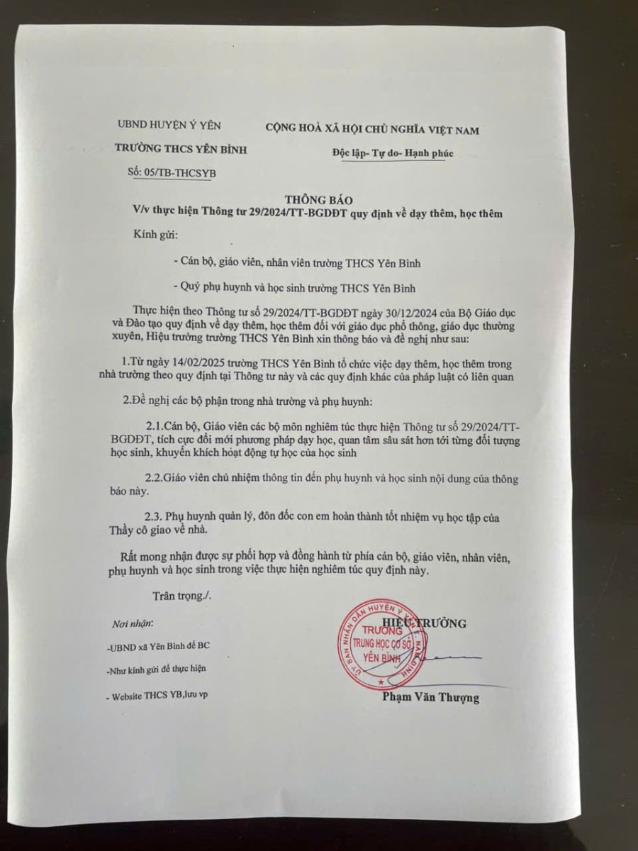 Trường THCS Yên Bình thông báo việc thực hiện thông tư 29/2024/TT-BGDĐT quy định về dạy thêm học thêm tới Quý phụ huynh và các em học sinh của trường.